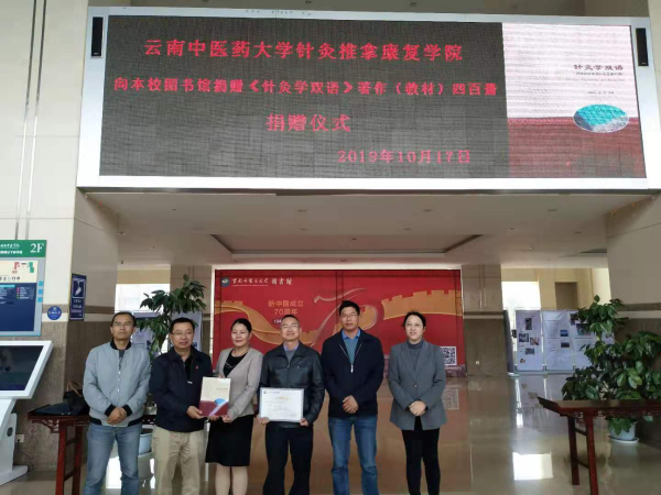 云中讯(通讯员 妥顺芬)10月17日下午15:00,针灸推拿康复学院图书捐赠仪式在云南中医药大学图书馆二楼大厅隆重举行,针灸推拿康复学院院长邰先桃教授、针灸临床教研室主任刘自力教授代表云南中医药大学省级针灸学双语教学课程项目组向本校图书馆捐赠了《针灸学双语》著作(教材)400册,价值五万四千元。出席本次捐赠仪式的领导和嘉宾有针灸推拿康复学院、图书馆、国际教育学院的各负责人。
