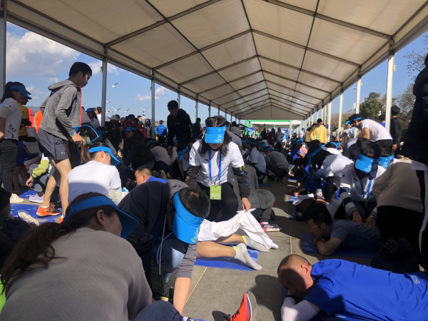 云中讯 (通讯员 赵嬿 )12月1日上午,来自全世界的2万名跑者齐聚春城滇池,参加上合马拉松比赛。为了顺利完成志愿服务,针灸推拿康复学院200名师生凌晨4点40集合出发至滇池海埂基地旁马拉松终点站等待进行志愿服务。上午8点30分,随着海埂会堂鸣枪起跑,来自35个国家和地区的2万名选手在滇池之畔并肩奔跑,用脚步丈量美丽昆明,在奔跑中畅享春城魅力。由针灸推拿康复学院教师党支部宣传委员赵嬿带队,针灸推拿康复学院200名师生为1200余名马拉松选手提供赛后肌肉拉伸放松推拿等志愿服务。
