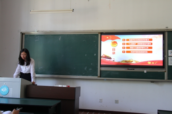 张粲同志以“发扬五四精神,永担时代重任”为题,从高度评价五四运动历史意义、“六点要求”深情寄语当代青年、用极大力量做好青年工作、党旗所指就是团旗所向等四个方面,深入讲解了习总书记在纪念五四运动100周年大会上的重要讲话精神,阐述了“不忘初心、牢记使命”的深刻内涵和重大意义,并鼓励各位党员教师充分发扬五四精神,敢于当担,勇于奉献。
