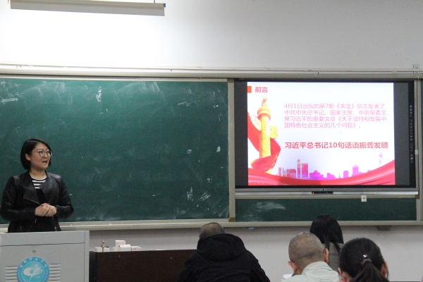 首先,针灸推拿康复学院组织员曲文慧同志就习近平总书记的《关于坚持和发展中国特色社会主义的几个问题》展开了讲述,并带领全体教师对总书记提到的“革命理想高于天”、“道路就是党的生命”等10句话进行详细解读,“正是我们党在探索发展道路方面独立自主的探索精神以及坚持走自己路的坚定决定,促使我们党不断从胜利走向胜利。”