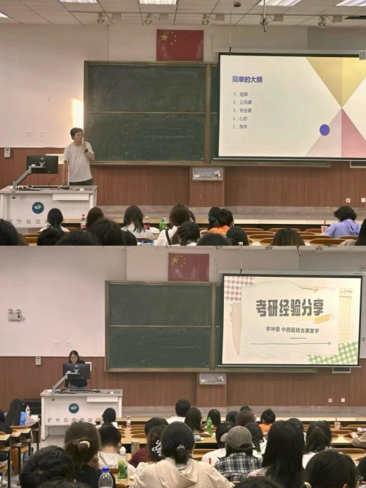 分享会上,30位学长学姐结合中医专业特色,从备考规划、学科重点、择校建议等方面展开分享。在中医综合复习上,建议构建“经典理论+临床思维”双体系,通过方剂歌诀记忆法、中药功效对比表等方法强化记忆;针对英语和政治,分享了资料获取方式以及相关考研名师;面对备考疲惫期,分享了兴趣转移、环境调节、冥想等减压法,并鼓励学习学妹们面对困难和压力时,要及时调整心态,始终保持乐观的态度。自由交流环节,学长学姐以“过来人”身份耐心解答疑问,就包括学校选择、跨专业备考、复习计划等问题展开热烈讨论。