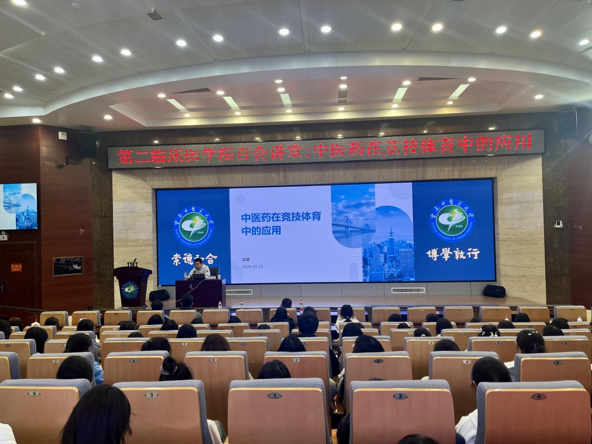 沈坚以《中医药在竞技体育中的应用》为主题,以个人求学、求职经历展开讲座。并结合工作实际,深入浅出地讲授了中医药在竞技体育中的巧妙应用、中医药通过竞技体育促进国际交流传播,以及中医药在竞技体育中面临的挑战与未来发展趋势。最后他鼓励学生通过重视中医基本理论学习、坚持经典研读与临床实践并重、加强现代医学知识学习、利用现代科技手段等,对中医药进行深入研究和探索。
