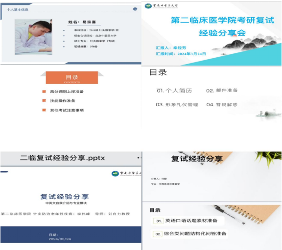 我校2023级针灸推拿学专业的幸经芳、李伟峰和中西医结合康复专业的付静以及北京中医药大学2023级针灸推拿学专业的易宗喜四位研究生。他们结合自身的考研复试经历,就复试的题型、如何准确获取各项有用信息分享自己复试答题技巧和心得,如何全面准备复试以及调剂相关流程等方面进行了全方位的辅导鼓励同学们要沉着自信,展示其专业素质,取得理想的复试成绩。