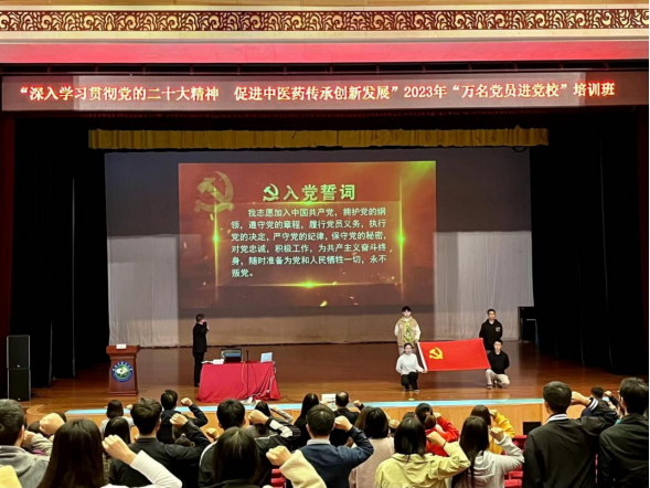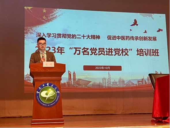 培训由民族医药学院党总支书记侯宾主持并作动员讲话,培训内容涵盖《中国共产党章程》解读、党的作风建设、党的二十大精神、中医药传承创新发展等内容。特邀云南师范大学纪委办副主任高腾作《党的纪律和作风》、云岭学者、南药研究院院长张荣平教授作《学好专业知识、提升科研能力,助力中医药传承创新发展》、民族医药学院党总支书记侯宾作《解读党的二十大:中医药文化的生态文明价值与智慧》、马克思主义学院副院长苗丽作《伟大变革坚定历史自信 强国复兴激发挺膺担当》、中药学院教授赵荣华作《深入学习党的二十大报告,促进中医药与民族医药、民族医药传承与创新》、马克思主义学院教授王珍喜作《中国共产党章程》、中药学院教工第二党支部书记蒋华夷作《透过“亚运之窗”感受中国文化之美》专题报告。