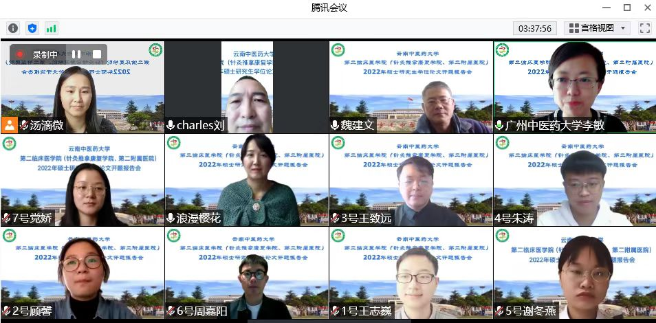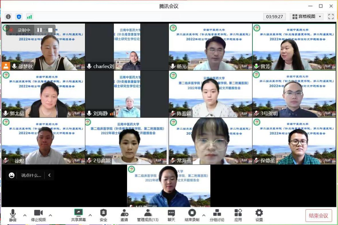 (通讯员 刘慧卿)102729我院集中对2021级97名硕士研究生举行学位论文开题报告会此次集中开题采用网络远程视频方式举行共分14场次分别邀请上海中医药大学、成都中医药大学、广州中医药大学、山东中医药大学、湖南中医药大学、天津中医药大学第一附属医院、湖北中医药大学、河南中医药大学第三附属医院、昆明医科大学、昆明理工大学、云南大学附属医院等省内外多所高校、医院的40名专家担任评审专家