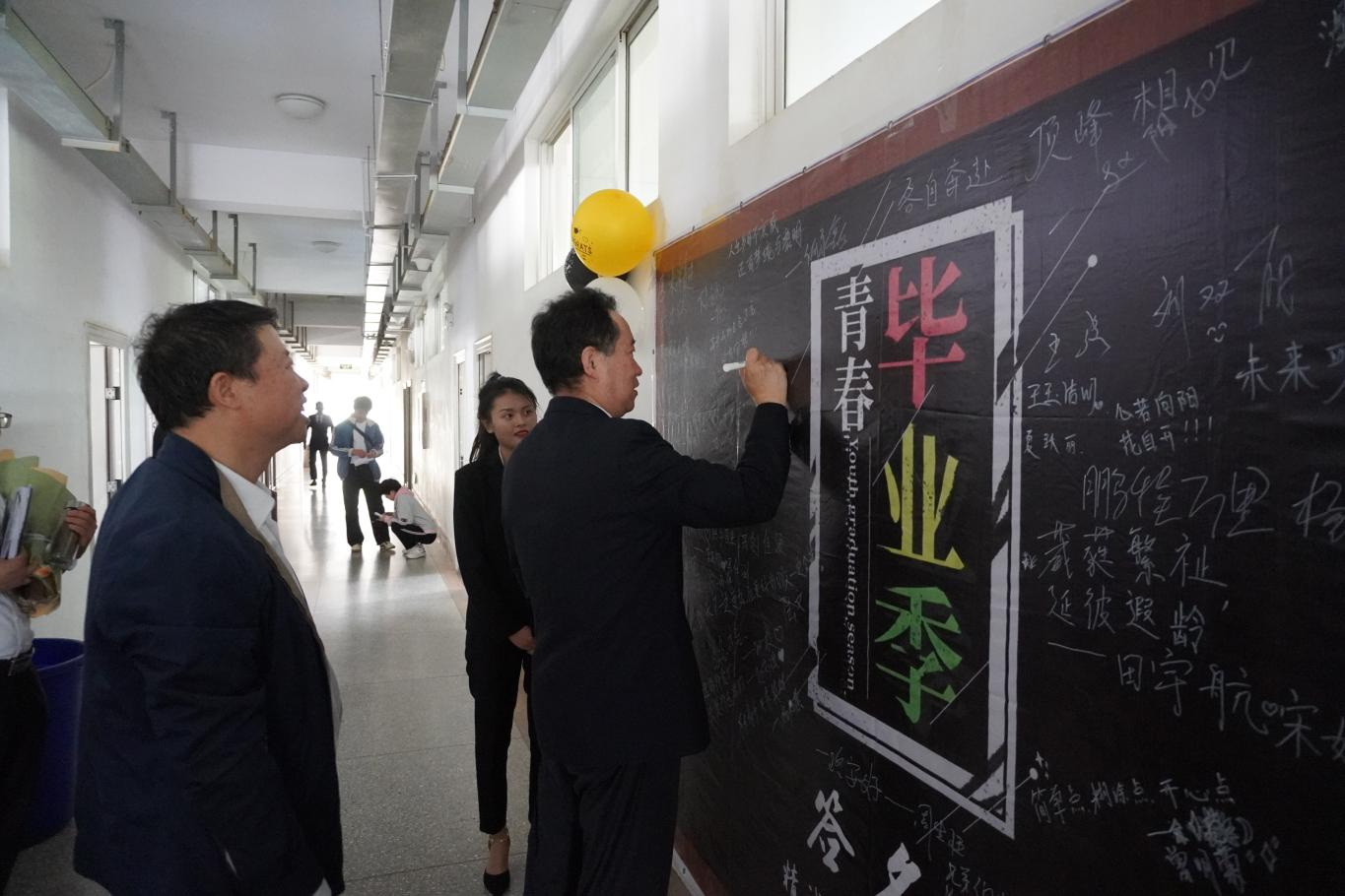 王翠岗2017级针灸推拿学1班的签名墙上写下“青春是用来奋斗的”寄语,激励青年学子砥砺奋斗,踏浪前行,在班级答辩现场,与同学们亲切交流,同学们备受鼓舞,热情高涨,激动万分。他还通过提问和点评的方式对同学们提出殷切期望:第一,志存高远,脚踏实地,在树立远大理想的同时,要脚踏实地、稳扎稳打,才能成就梦想;第二,不断坚定志气,锤炼骨气,充实底气,勇担实现中华民族伟大复兴的重任;第三,积极尝试,敢于推销自我,先就业后择业。