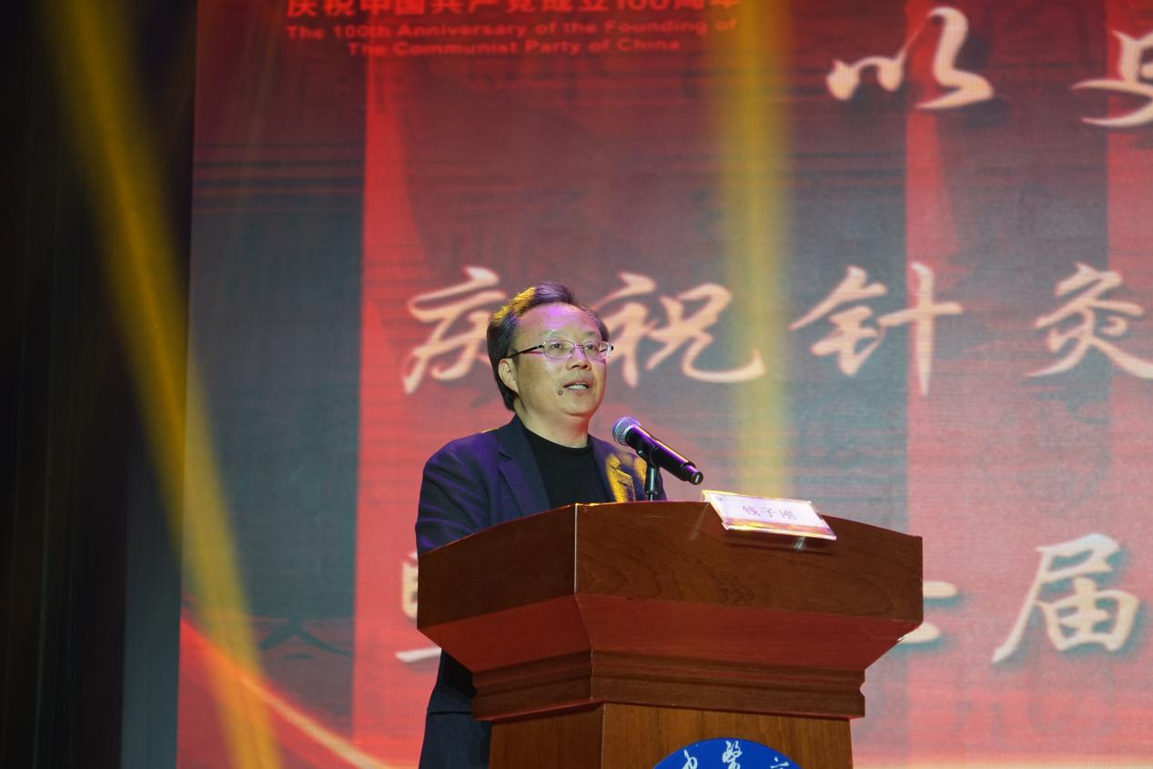 校领导钱子刚教授为晚会致辞。他肯定了学院成立10年来各方面所取得的优异成绩。他指出,“针康文化节”已经举办七年了,活动从单一到系统,从简单到多元,越来越丰富,针康文化节搭建了一个师生可以广泛参与的平台,也是党史学习教育的一个重要抓手,并希望师生在活动中长见识、增才干、学本领,从百年党史汲取奋进力量,把针康文化传承好发展好。