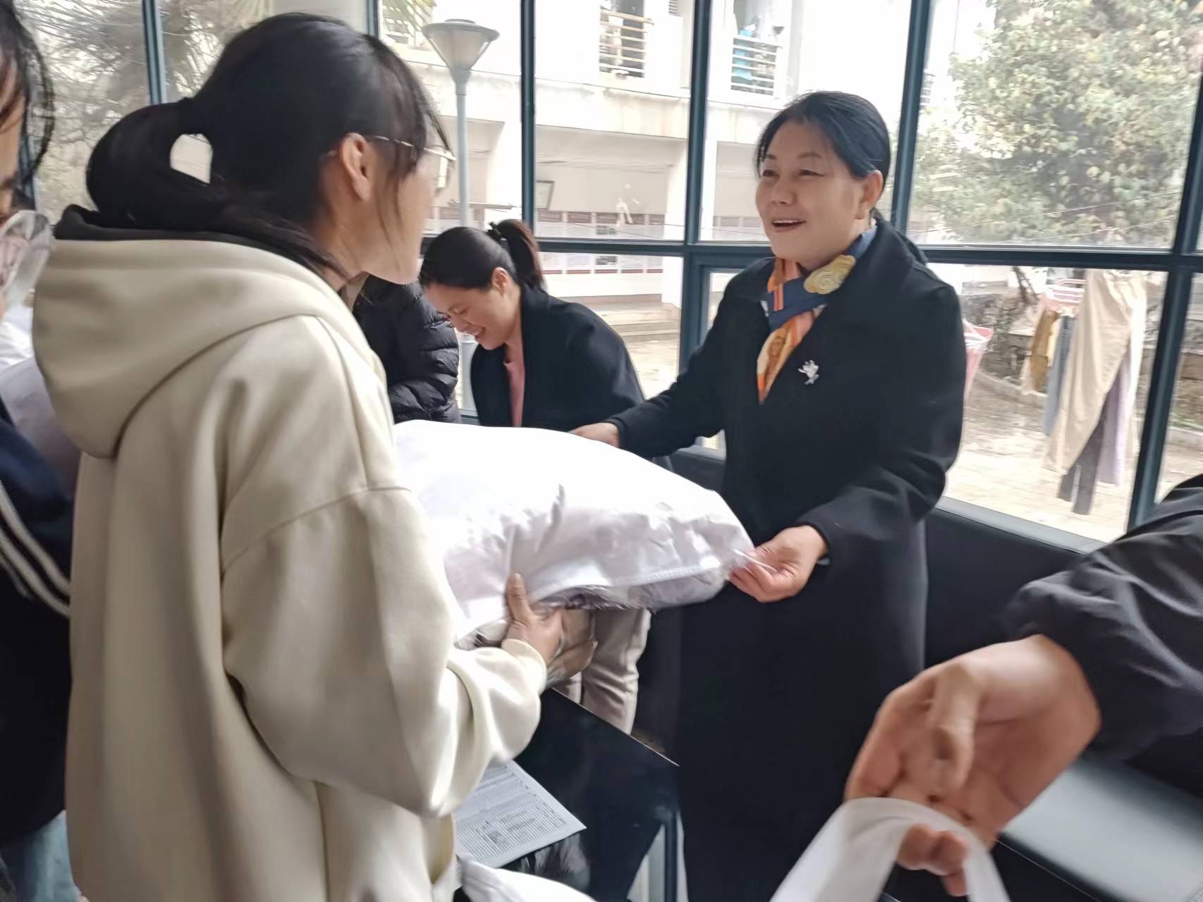 云中讯 (通讯员 杨艳芳)“寒冬将至,温暖相伴”,为精准贴心帮扶经济困难学生、满足资助对象的现实需要、增强学生的归属感和幸福感,第二临床医学院于12月8日在银杏苑学生社区举行了暖冬慰问品发放活动。副校长邰先桃,学院党委书记唐柱生、学生处副处长贾婧崟,学院纪委书记陈文斌、学生党总支书记王丽娟,学工班主任杨延芳,辅导员杨美玲参与此次仪式,为学生发放毛毯三件套并对学生送去关心和问候。