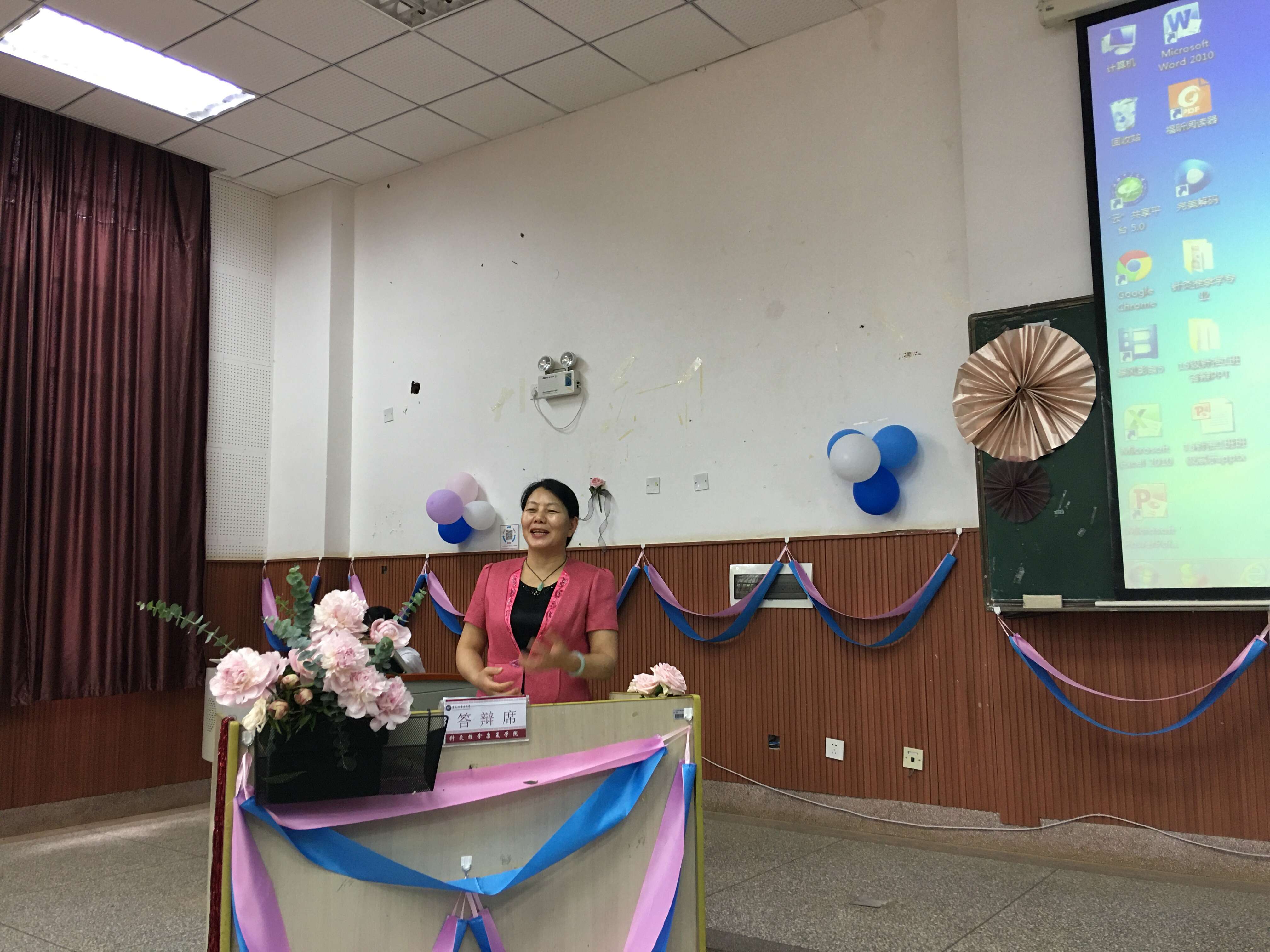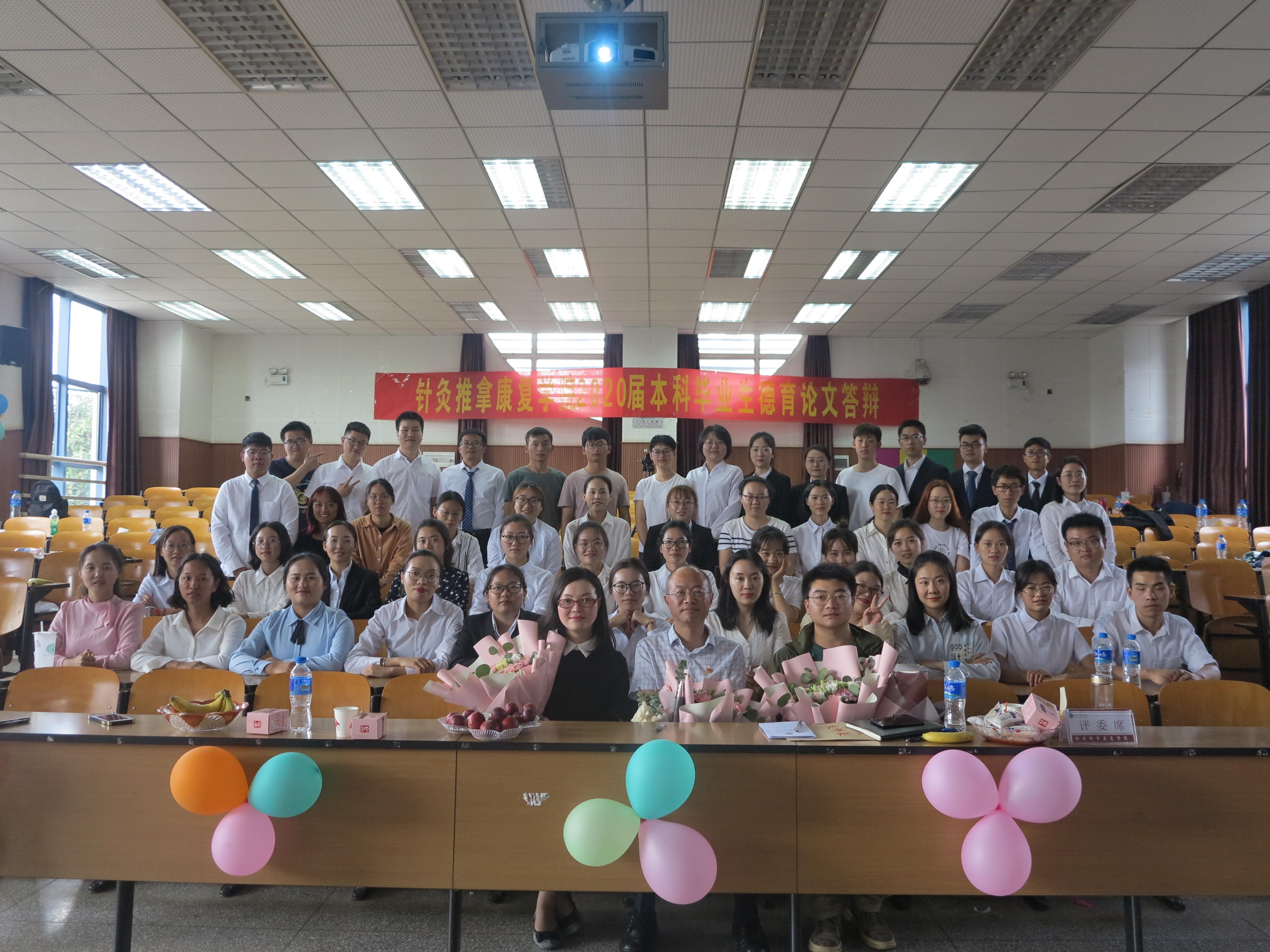 答辩开始前,各班级通过悬挂照片墙、摆放寓意感恩和祝福的鲜花,将会场布置得温馨而热烈。德育答辩以班级答辩开始,各班级回顾了入学以来班级和同学们的共同成长和团结奋斗取得的荣誉,展示了班集体团结奋发的大学历程,让评委老师深受触动。