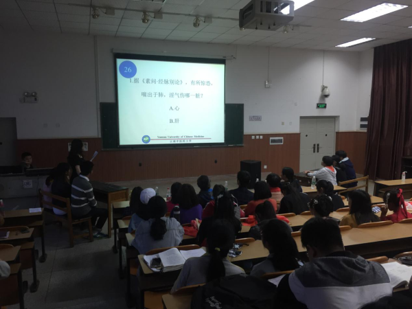 (云中讯 杨延芳 王厚融) 为激励更多的同学将时间和精力投入专业学习中,也为激发大家对中医经典理论和传统功法的学习热情。2019年4月3日19:00—21:00,针灸推拿康复学院在呈贡校区1208教室成功举办了首届百会知识竞赛的决赛活动。受邀参加活动的嘉宾有院长邰先桃教授、针灸基础教研室袁恺、推拿基础教研室郝敬红、康复治疗学教研室吴丹丽、中医康复学教研室华云珍和谢官莉、中医养生学教研室万雪娇等指导教师。2017级、2018级“百会”班的全体同学参加了此项活动。
