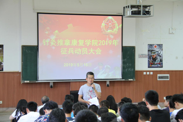 云中讯(通讯员 黄婷婷) 5月16日中午,针灸推拿康复学院在1214教室召开2019年征兵动员大会。参加此次动员大会的有学工部副部长、武装部专职副部长王骏,针灸推拿康复学院党委书记王燕,副书记杨剑南,全体辅导员、班主任,以及全院在校男同学共200余人。