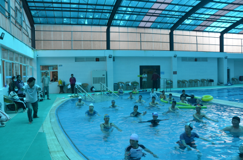水疗实践课主要分为4个环节。首先,由保健康复中心的主管治疗师曹吉华向同学们深入浅出地讲解了温泉水疗的治疗原理、适应症及禁忌证,以及在脑卒中、骨关节病、运动损伤等康复中的应用;接下来,由肖波老师与真实的脑卒中患者一起,向大家演示了脑卒中偏瘫患者如何在水中进行PNF训练,以降低肌张力、强化肌肉力量,以及优化运动控制;之后,同学们与下腰痛患者共同练习了简化版的水中太极,在舒缓的一招一式中,切身感受着水的阻力与浮力对关节活动度与肌肉力量的精妙调节;最后,曹吉华老师带领同学们进行了Halliwick技术的实践操作,同学们在水中相互协作,完成平衡控制与协调性任务,在实践中深刻领悟水疗对于提升身体感知与控制力的独特临床价值。