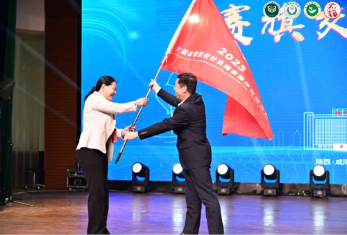 在大会闭幕式上,邰先桃副校长代表学校作表态发言并从组委会手中郑重接过大赛旗帜,这标志着2027年第九届全国高等院校针灸推拿临床技能大赛将正式由我校承办。