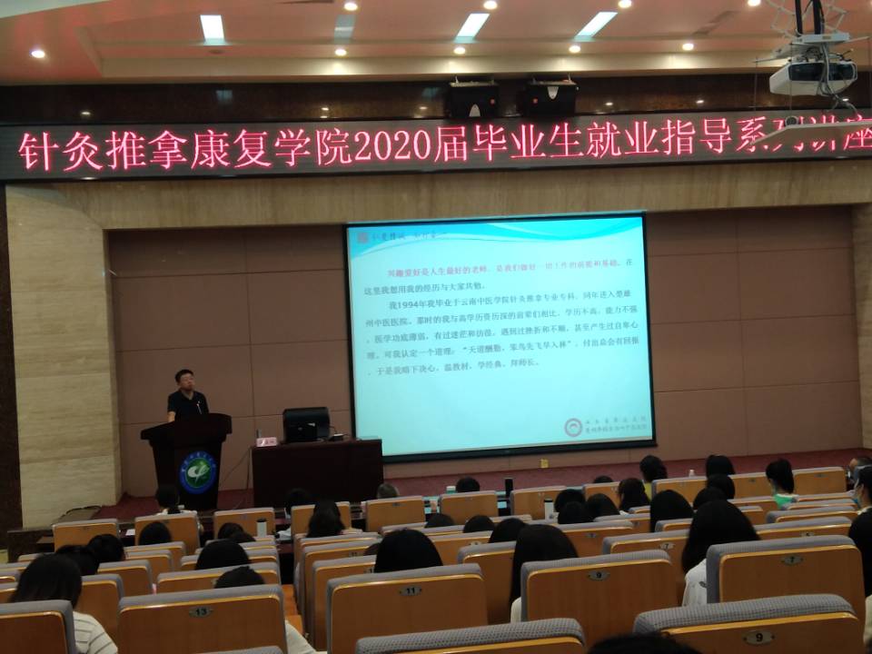 云中讯 (通讯员 杨艳芳)为贯彻落实省委教育工委、省教育厅云南省高校毕业生就业工作视频调度会精神,统筹推进疫情防控和学生就业,努力将疫情对毕业生就业创业的影响降到最低,确保完成2020届毕业生就业创业工作目标,针灸推拿康复学院组织举办了2020届毕业生就业指导系列讲座。