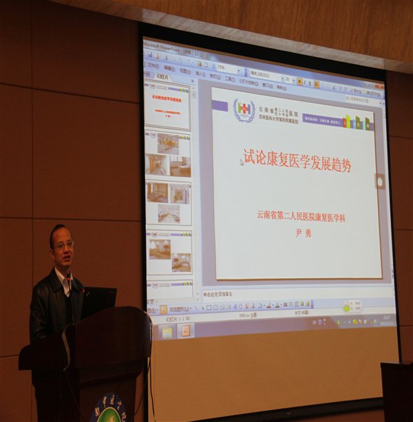 云中讯(通讯员 华云珍)2013年12月12日晚18:30,在翰墨楼一楼报告厅,针灸推拿康复学院邀请云南省第二人民医院康复科主任尹勇教授做“康复医学的发展前景”专题讲座。此次活动由针灸推拿康复学院邰先桃副院长主持,康复教研室全体教师和12级、13级康复治疗学专业班学生参加。